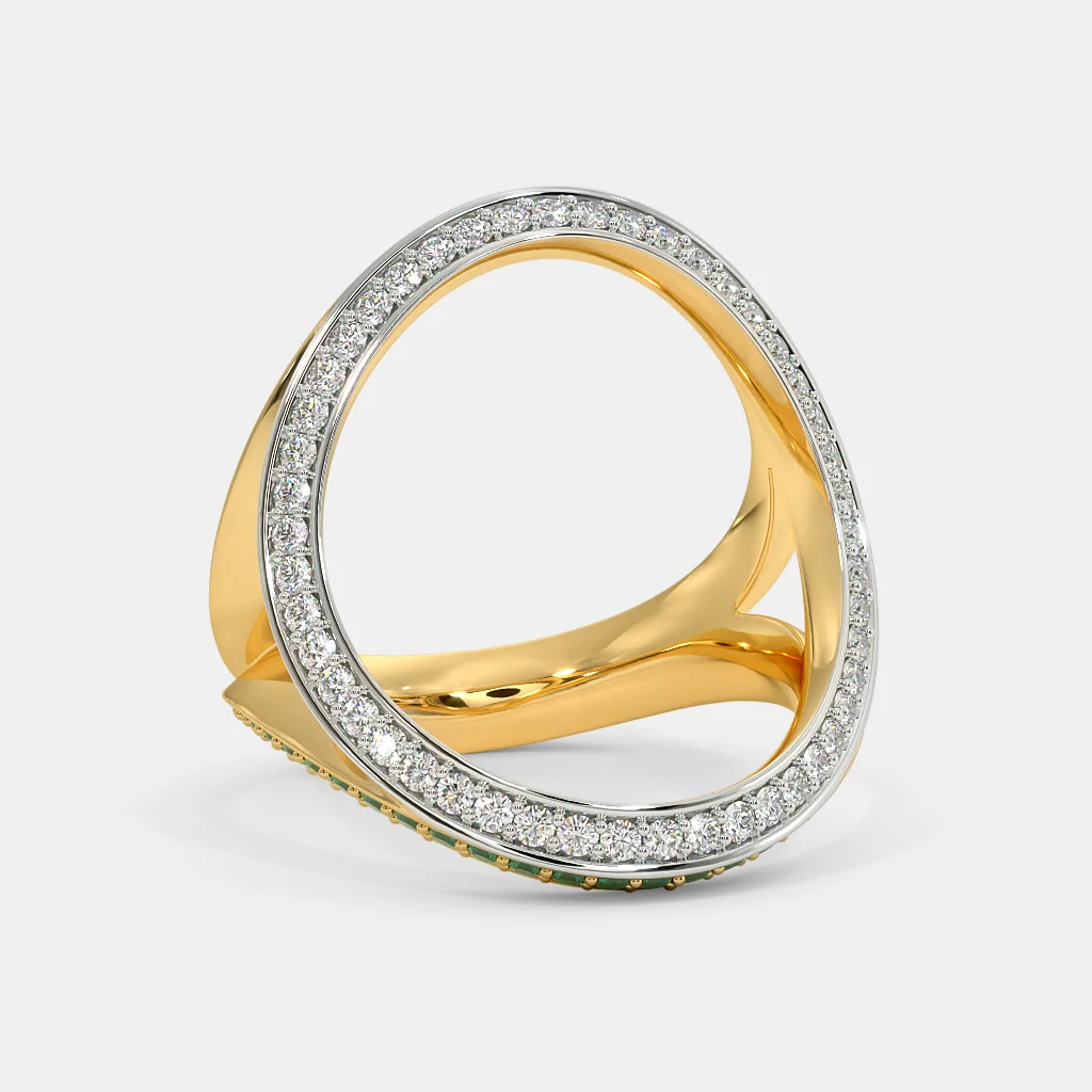 The diamonds, set along the ring’s edges, bring exceptional sparkle, while the emeralds provide a vibrant contrast that adds depth and color to the piece. The two bands intertwine elegantly, creating a striking visual effect that is both bold and refined. This ring’s unique combination of gemstones and its modern form make it an ideal statement piece for any occasion.