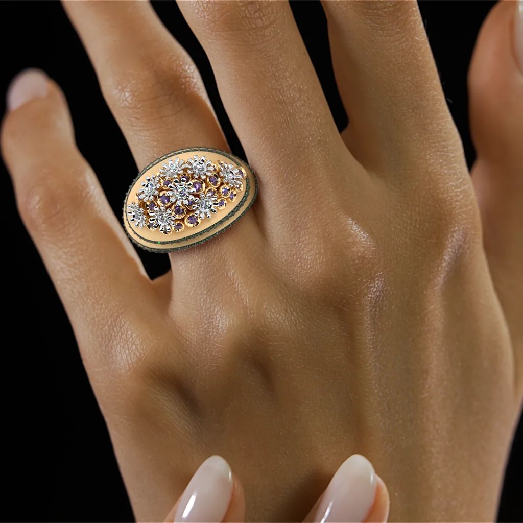This exquisite Floral Embrace Ring is a perfect fusion of opulence and nature-inspired design. Expertly crafted in 22K gold, this striking ring features a series of delicate floral clusters, each radiating with brilliant-cut diamonds and rich amethyst gemstones, bringing vibrant color and brilliant sparkle to your look.