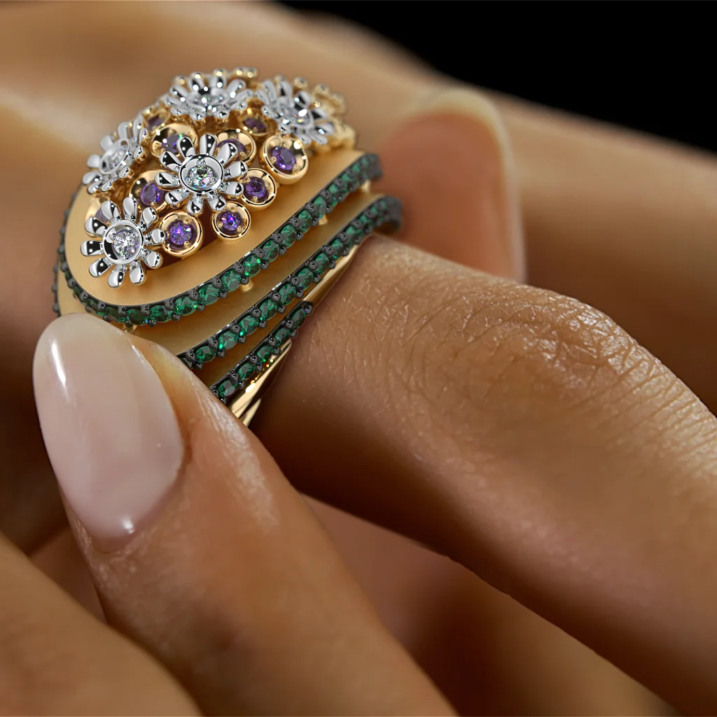 This Floral Embrace Ring is a true testament to craftsmanship and beauty. With its captivating floral design, vivid gemstones, and sparkling diamonds, it embodies the essence of luxury, making it a must-have piece for those who appreciate fine jewelry with a timeless charm.