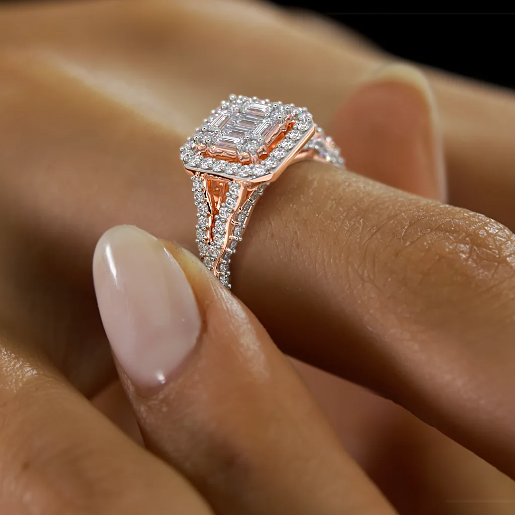 A dazzling 22K rose gold ring showcasing a stunning emerald-cut diamond center, surrounded by a halo of sparkling diamonds for an unforgettable display of elegance.