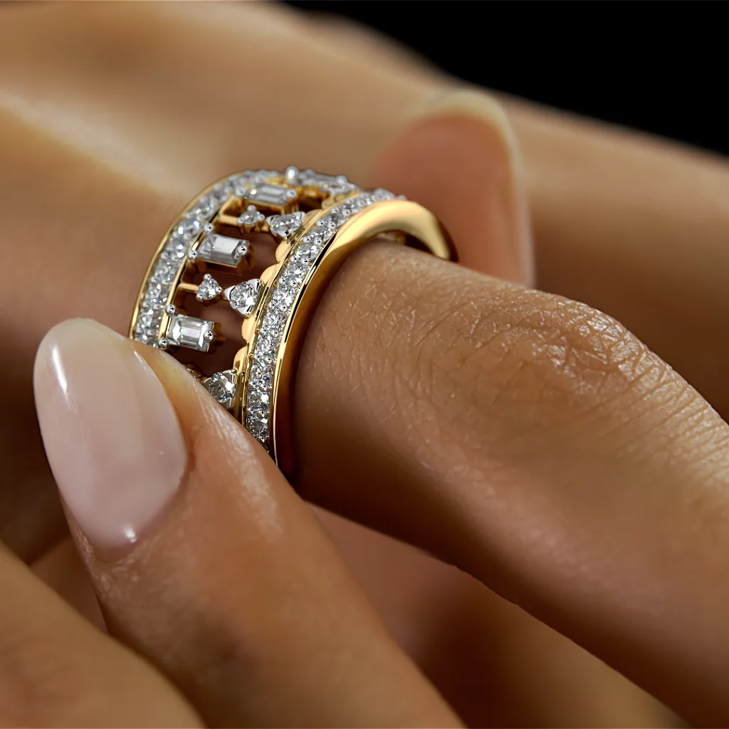 The Regal Cascade Diamond Ring is not just jewelry — it’s a statement of stature. With its harmonious blend of classic cuts and contemporary structure, this piece adds a luxurious edge to every look, commanding attention with timeless sophistication.