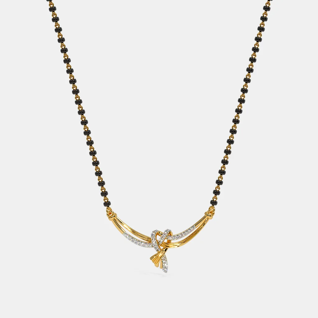 With its poetic ribbon design and sparkling stone detailing, this mangalsutra beautifully balances romance and refinement. Whether worn daily or on special occasions, it’s a stunning reminder of your most cherished bond — a true celebration of love wrapped in gold.