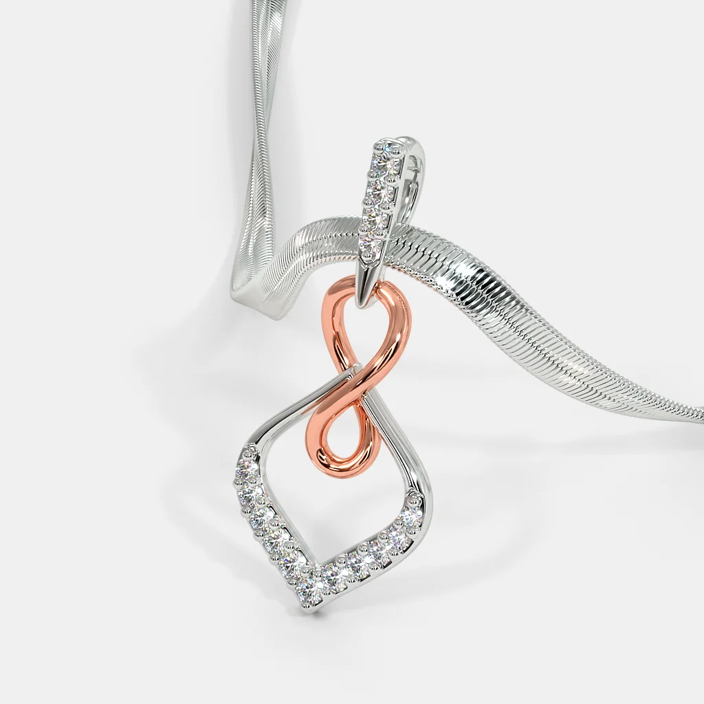 This Infinity Spark Diamond Pendant is a timeless symbol of love and connection, designed to captivate and elevate your style. Expertly crafted from a blend of high-quality 18K white and rose gold, this pendant features an elegant infinity motif at its heart, intertwined with brilliant-cut diamonds that shimmer with every movement.